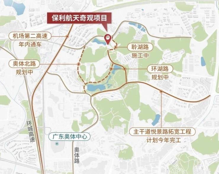 距离地铁21号线大观路站约1.7公里,步行约20分钟周边有大观路、广园快速路等主干道,自驾可快速到达珠江新城、金融城、科学城等核心区域。同时,奥体中心周边路网正在升级,未来交通便利性将进一步提升。