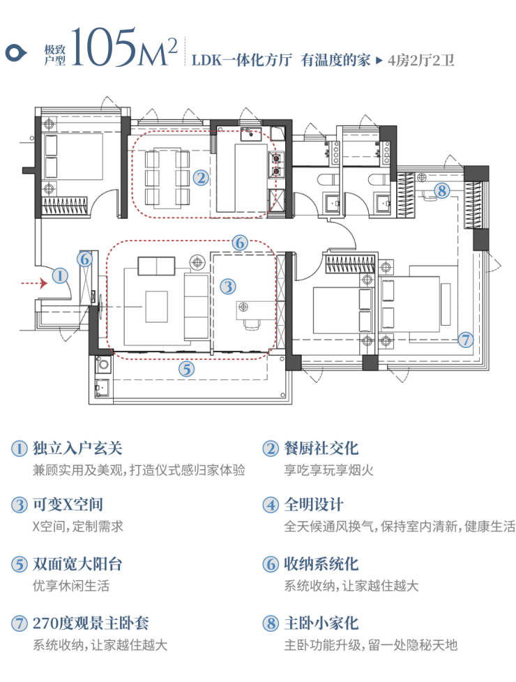 105户型4房2厅2卫设计,精心规划了4.5开间朝南,更加注重居住舒适度设计。开放的餐厅与客厅空间南北通透;餐厅中心化设计,结合开放式厨房与餐桌互动;净尺寸5.1米餐厨一体化,提供更多生活场景,可分可合可塑性强。