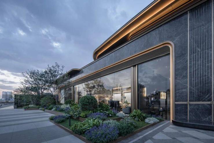 具有仪式感的门楼,搭配拉长的入口雨棚延展面与两侧的对称式布局,共同勾勒出长约80米的城市美学界面。入口门厅采用玻璃云石和爱马仕灰石材+香槟金色铝板,地面采用奢华酒店的经典纹样作为铺装的母版,结合木棉花形态,通过艺术变形、简化后,打造专属宅印。