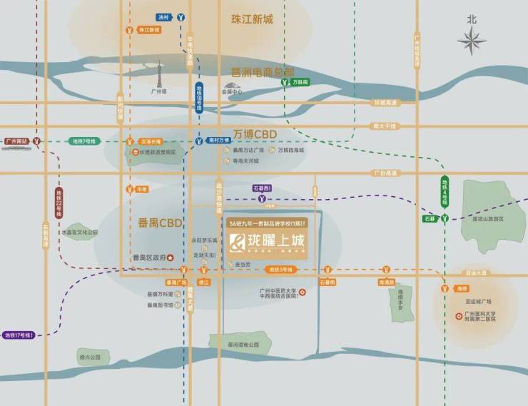 项目位于广州南拓中轴金脉之上,上联万博/琶洲/珠江新城,下联广州未来副中心南沙,承上启下,定鼎未来番禺生活新中芯。且项目近番禺区府板块,依托区府丰富资源和高级规划,具备无限发展潜力与优势。同时依托3号线东延线,于亚运大道经济带中轴线上,联动其他TOD集群+5大创新园区,以“TOD+轨道+产业+社区”发展模式,实现职住平衡,与千亿产业发展共生共荣。