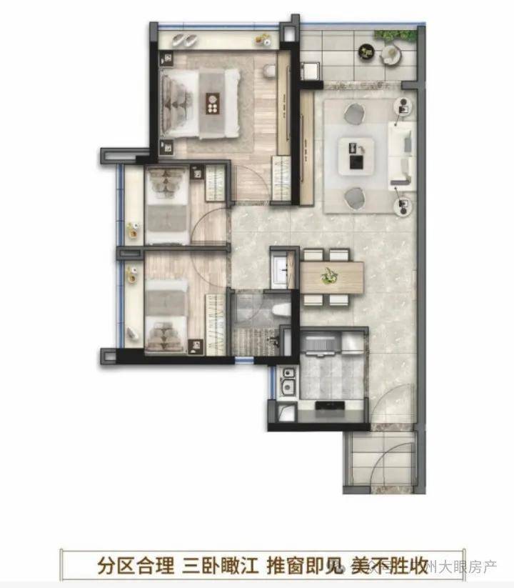 南北双阳台对流,江景尽收眼底,四开间朝南,三卧室南向瞰江