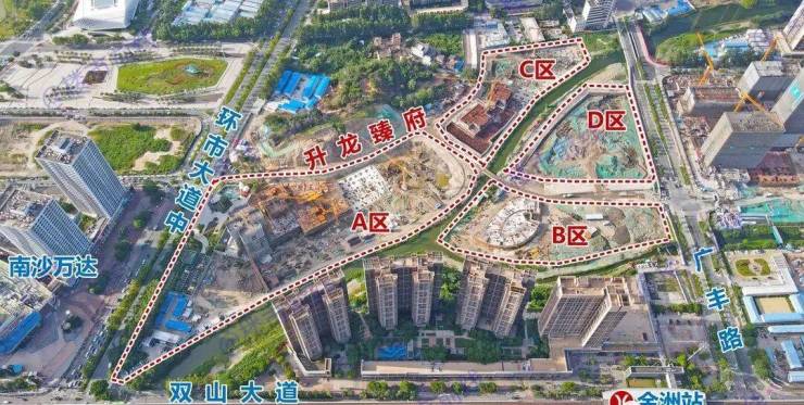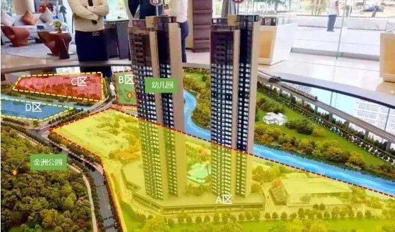 整个项目总占地约8.3万㎡,总建筑面积约35万㎡,内部分为A、B、C、D共4个区域,每一区之间有金洲涌分隔。由于是旧改项目,所以C、D区用作回迁安置,共有8栋,以两梯六户跟两梯四户为主。A、B区8栋为商品房。