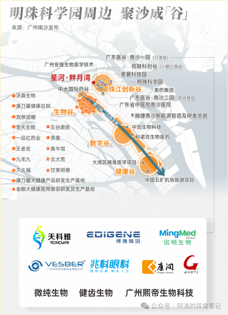 世界一流科学城,核心起步区「南沙硅谷」的明珠科学园,已进驻中科院等10多家研究院及科研机构。且周边云集广东医谷、中大药谷、生物谷等众多产业园,已落地王老吉、茶里、天科雅等企业400多家。