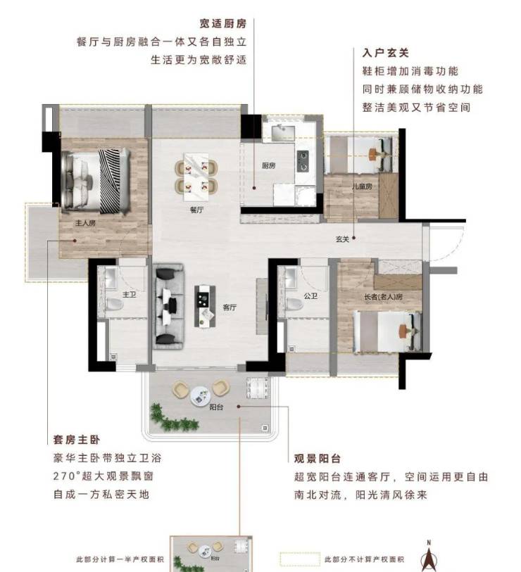 南北通透|主卧 270°飘窗+双飘窗|U 型厨房|南向观江景阳台