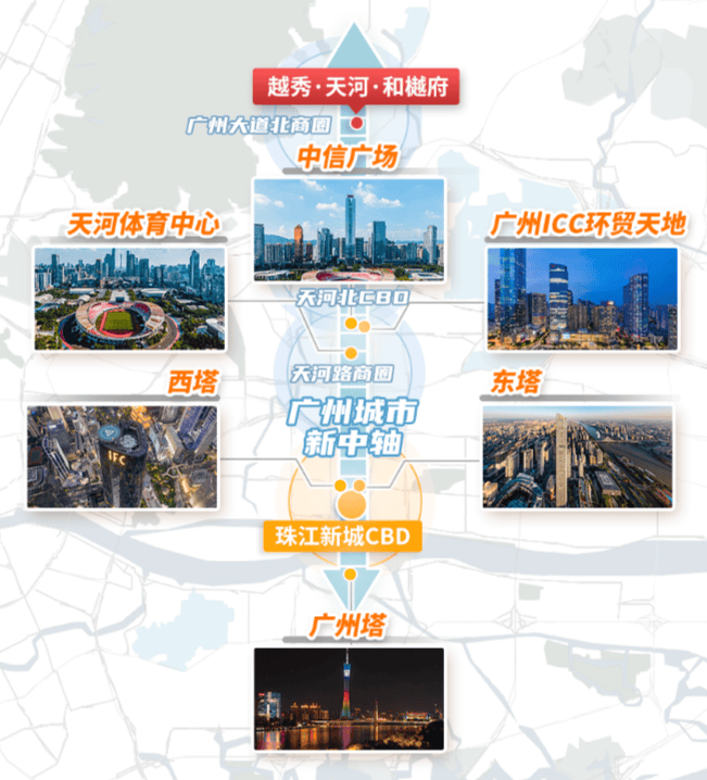 信达金茂广场:位于广州天河区广州大道北与地铁3号线梅花园站交汇处(步行约260米),由信达地产与中国金茂联合开发,总建筑面积33万㎡。项目涵盖7栋金茂府系高端住宅、3栋轻奢商办产品及约12万㎡Jerde捷得时尚商业中心,形成住宅、商业、商办复合业态。