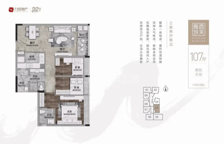 建面107-108㎡三房两卫总价728万-810万,是目前在售主力户型,可选楼层较多,户型方正通透,客厅开间宽敞,搭配观景阳台,视野开阔
