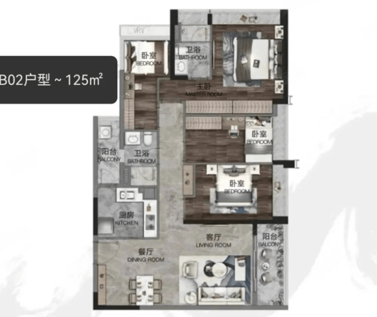 建面125㎡四房两卫总价869万-945万,主打空间功能性,双阳台设计实现休闲与晾晒分区,U型厨房操作动线合理,能同时容纳多人备餐