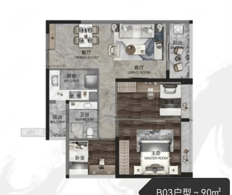 主卧带独立卫浴和飘窗,兼顾私密性与舒适度,另外两个次卧空间方正,可作儿童房或长辈房,满足三口之家基本居住需求