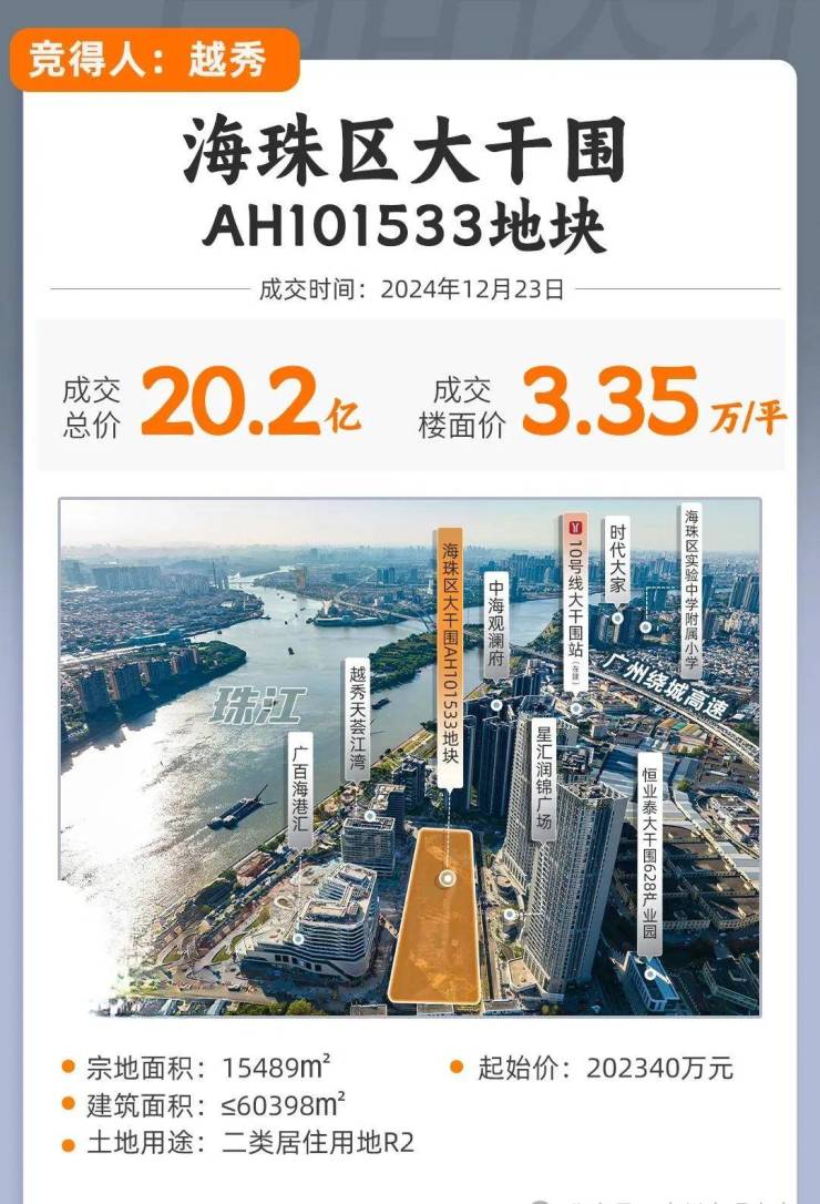2024年12月23号,海珠大干围地块被越秀以20.23亿元拿下,楼面价为33501元/㎡。