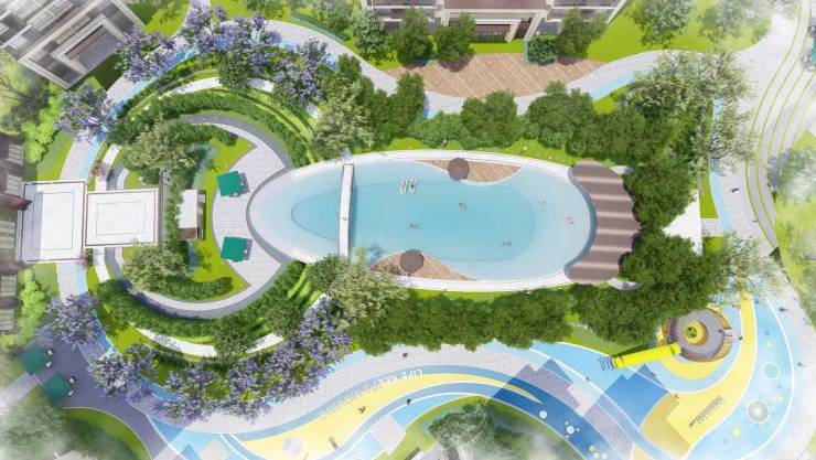 社区内打造中式风情园林,结合岭南水乡文化的无边界跌水泳池;园林中打造全龄活动空间,让休闲、锻炼一样充满绿意。