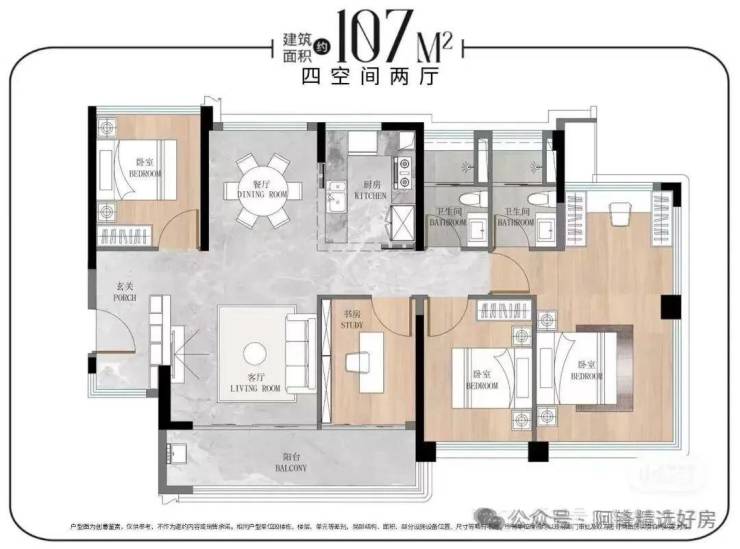 一是三代居户型,卧室分两区设计,其中一间卧室独立设于入门区域。