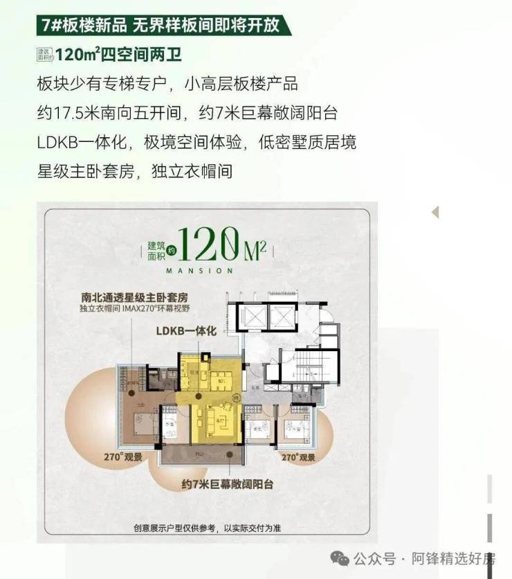 建面约120㎡,全广稀缺新品,专梯专户,12-13F洋房设计。五开间朝南,约17.5米南向巨幅面宽,南北通透,LDKB式设计,超高得房率,奢享大平层使用感。