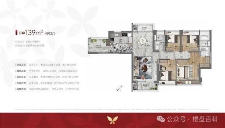 小区6栋楼半围合式分布,45度“风车”户型联排,做到不同的户型的主要室内空间都朝南向排布,尤其卧室空间,几乎做到了100%朝南;约76-139平三至四房,户型方正,高端品牌装修风格。