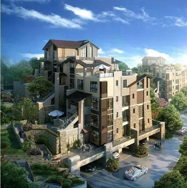 别墅外墙采用双层中空玻璃门窗、天然石材和其他高档材料装饰;所有别墅均为三层,并按原地形布置,步移景换,错落有致。