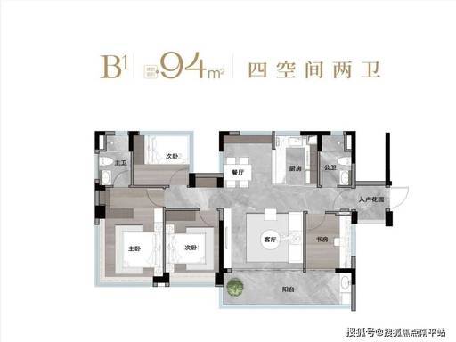 94㎡ 四房两卫:LDKB 一体化,双阳台设计,三口之家优选。
