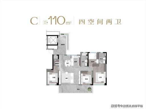 110-125㎡ 四房三卫:阔绰横厅,多开间朝南,专梯入户,改善家庭一步到位。