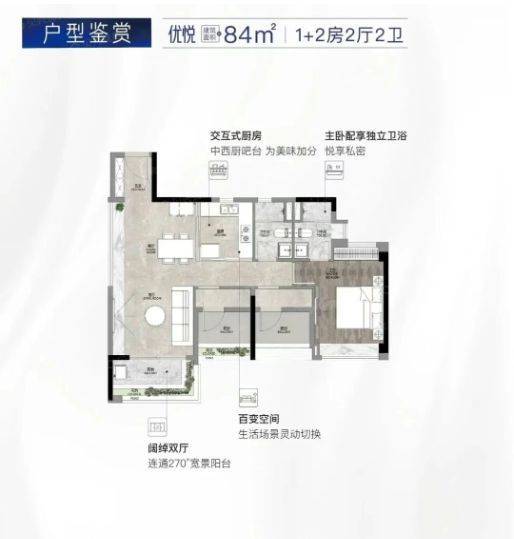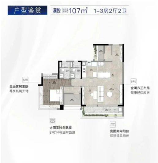 约107㎡四房两卫:主卧带270°转角飘窗+6米景观阳台,视野开阔;功能分区明确,动静分离,居住舒适度媲美改善盘。