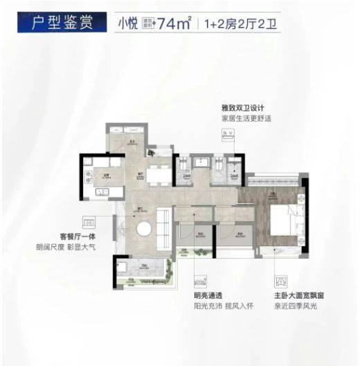 约74㎡三房两卫:在同面积段里罕见做到双卫,还额外赠送0.5卫空间,适合三代同住或二胎家庭,私密性大大提升。