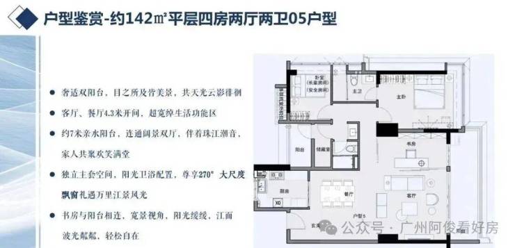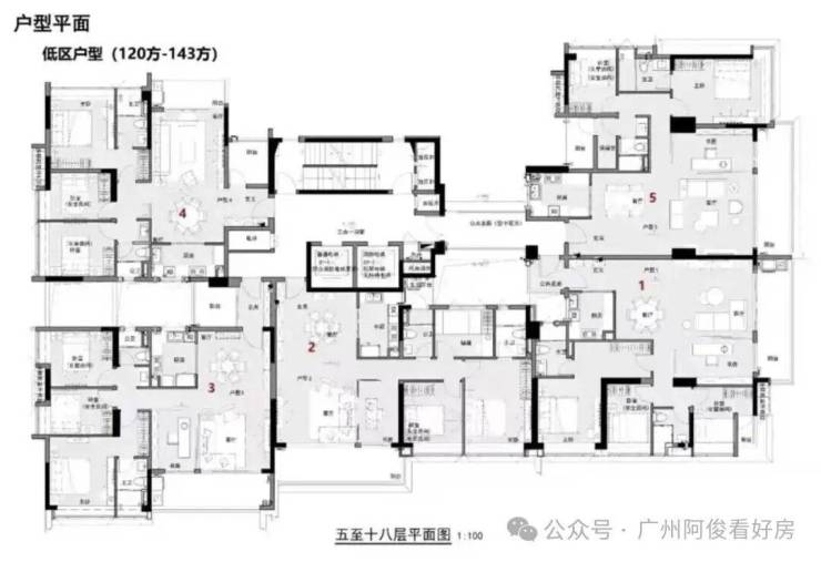 层高:5-18层,2梯5户,为120-143㎡四至五房