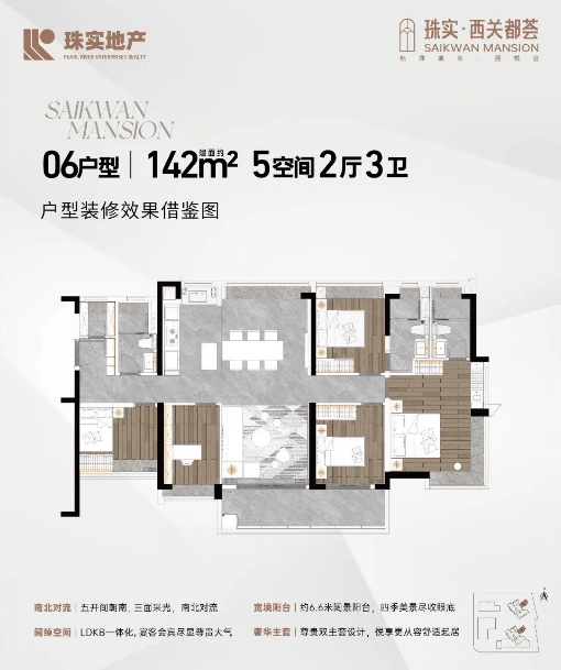 建面约142㎡5房2厅3卫则面向改善家庭,大宅布局满足多代同堂需求,空间开阔,功能分区完善,部分房源还能享受珠江视野,提升居住质感。