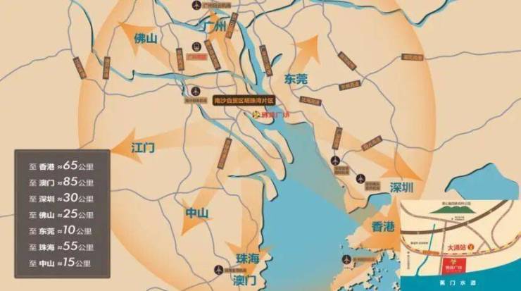 项目紧邻城市主干道——环市大道,距离地铁四号线延长线大涌站仅300米(步行时间为5分钟),距离广州主城区45分钟车程,1小时内快速抵达珠三角各城市,周边配套齐备。项目离南沙区政府直线距离约5公里,地铁4站即到;离南沙客运港直线距离6公里,地铁3站即到。