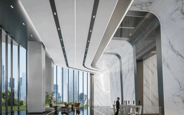项目大堂搭配意大利进口云纹石材曲面墙面设计,以三维冷弯工艺雕琢成环绕建筑的时光幕帘。晨光漫过32°倾斜的穹顶,那些被精心计算的折射角度,会在中庭洒落不断变幻的光瀑。近乎奢侈的曲面叠加、仰首可见的流线型穹顶与流转的光影、环绕四周的云纹肌理,则沉淀着百年石材历经地质运动的从容气度。南入户大堂外将会改造玻璃房,目前规划引进新派咖啡厅,兼顾商务社交与办公需求。