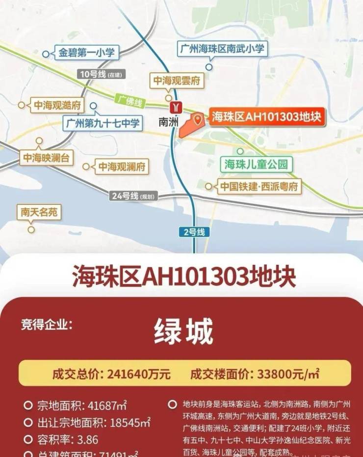 2024 年 12 月 5 日,海珠老城区的海珠客运站地块成功出让,绿城以约 24.16 亿元总价拿下,折合楼面价约 3.38 万 /㎡(未扣除配建)