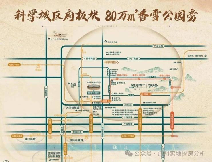 5、交通与区位,位于科学城核心香雪板块,出门即香雪大道,自驾30分钟可通达珠江新城。周边有轨电车2号线玉岩路站,可无缝接驳地铁6号线,交通便利性逐步提升。