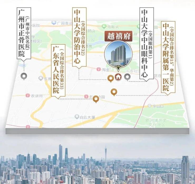 医疗:与中大附属防治中心、中大眼科中心等三甲医院仅一路之隔;附近还有中山大学附属第一医院、广东省人民医院等优质医疗机构。