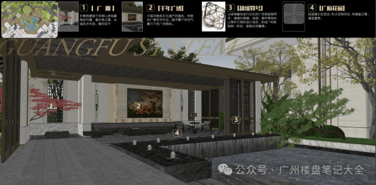 ,融入广雕、千年广绣、广府花窗设计,如广雕对景照壁源于余荫山房抽象龟纹石雕,寓长寿之意、镇宅安宁;广府花窗,寓意满堂富贵等,代表广府的美好祝愿