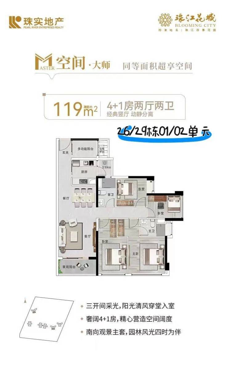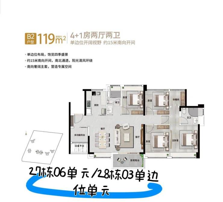 119㎡4+1房2厅2卫(横厅)单边位布局,15米南向开间,南北通透,改善户型首选。
