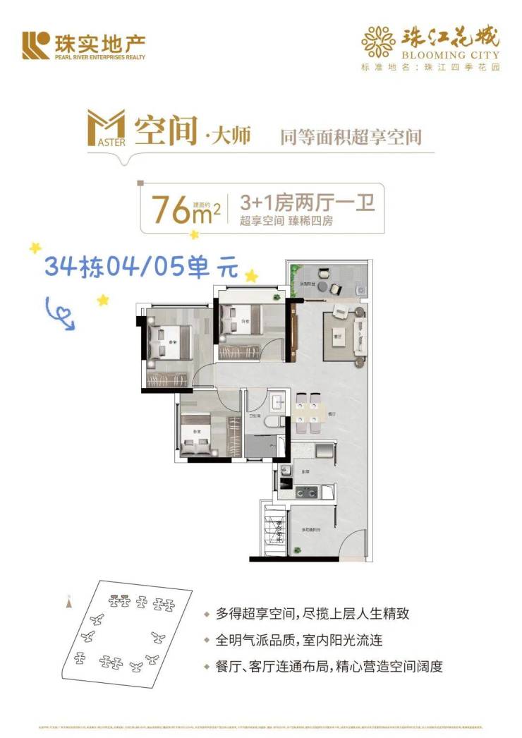 户型的设计,关乎着生活的实际感受。珠江花城【公园里】臻筑建面约76-140㎡3房+1空间至5房户型,在空间利用上颇具巧思,多得一空间的设计,不仅总价少花30万,更让居家功能与舒适感自然升级,无论是作为兴趣的天地、成长的乐园,或是静思的角落,皆由主人随心定义。