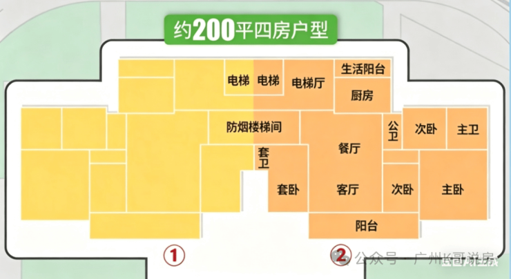 7.纯板楼设计,主打130-200㎡大平层,两梯两户南北通透,符合白云新城高端居住定位,注重居住体验和品质感。