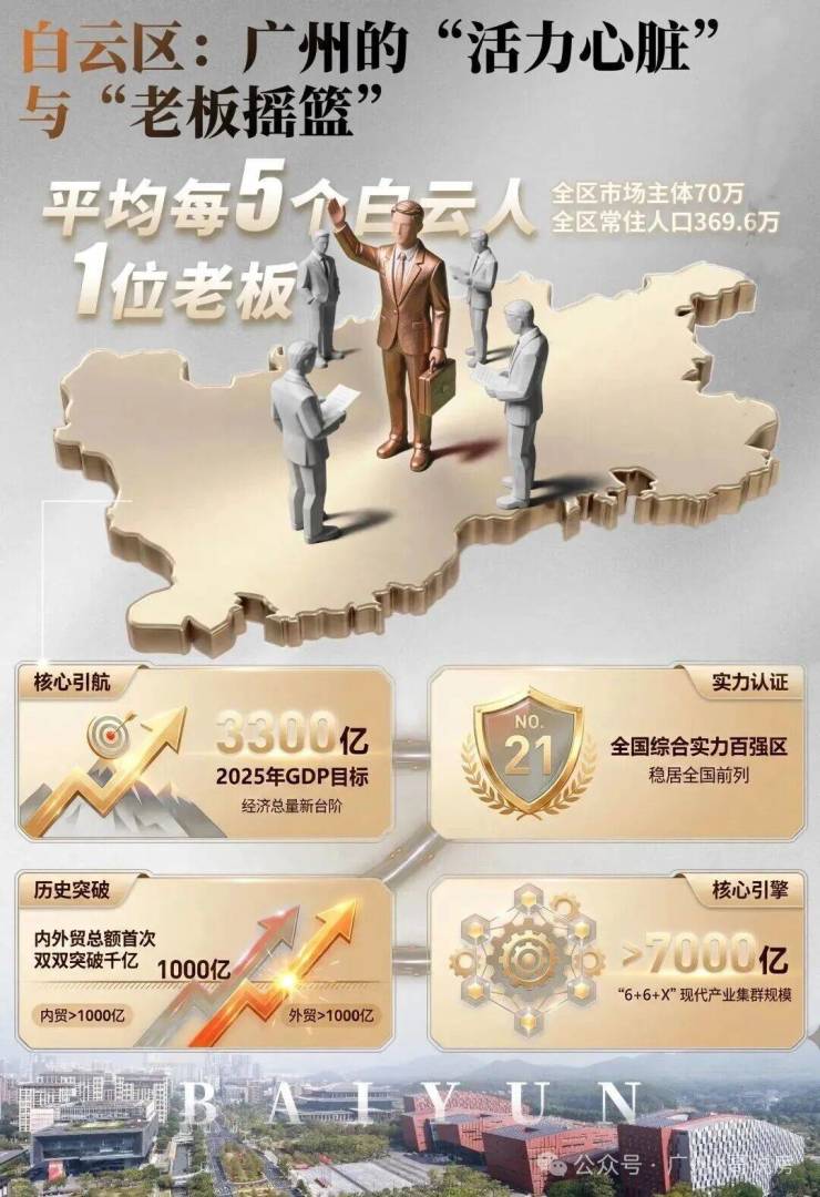 2025年,白云区GDP剑指3300亿,跻身全国综合实力百强区第21位,赛迪创新百强区第20位。