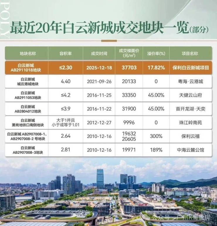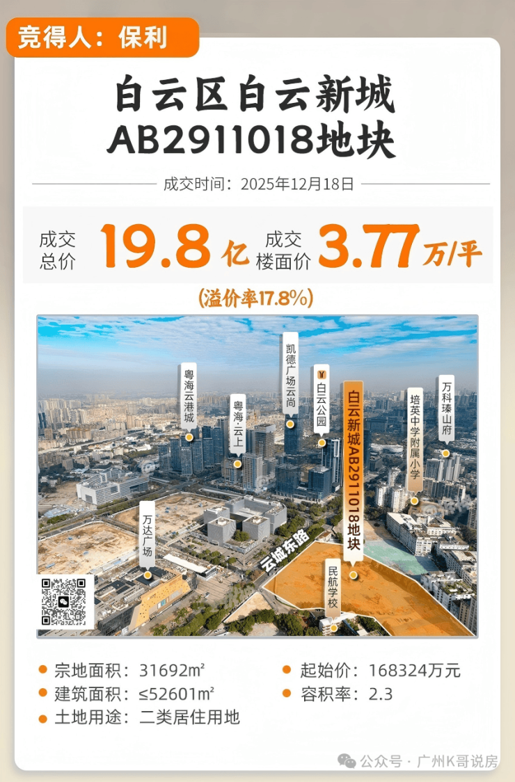 2025年12月18号,保利发展以19.8亿元夺得白云区白云新城AB2911018地块,楼面价37703元/平。