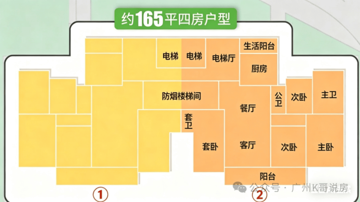 165㎡四房三卫,电梯厅升级到11个方,还能通风和采光。只有#5栋两条梯腿。