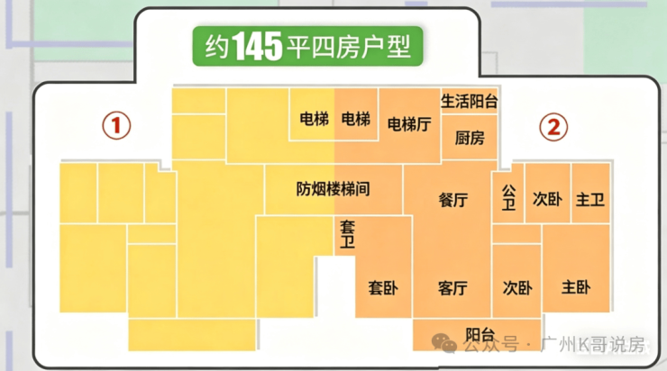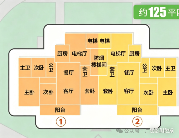 130㎡四房三卫,电梯厅约有9㎡,相当于一个次卧的空间。分别位于#1栋与#2栋。