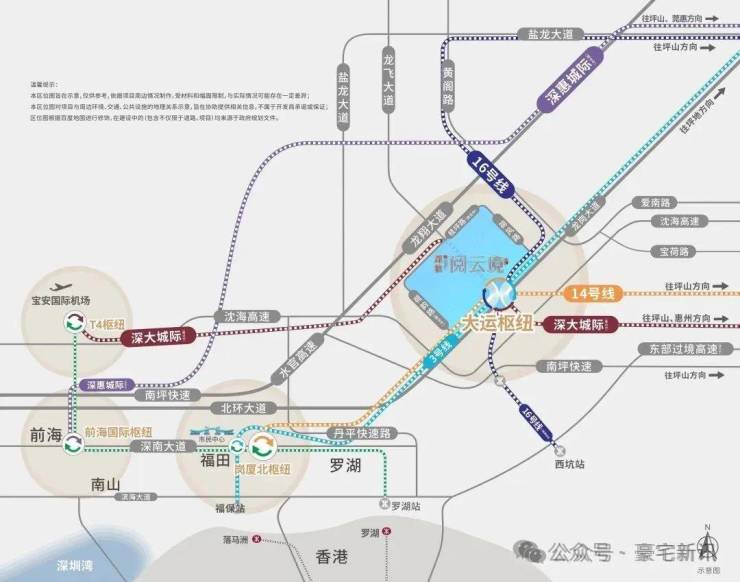直连大运枢纽,东部唯一集城际、快线、普线于一体的交通枢纽,四轨交汇,3/14/16号线(已开通)和深大城际 (建设中),约28分钟福田岗厦北,半小时宝安机场南山前海。
