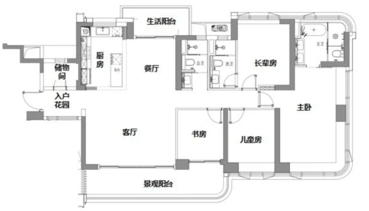 143㎡四房两卫:空间更加阔绰,生活阳台与景观阳台相呼应,增加了空间的通透感。主卧套房设计,配备独立卫生间和储物间,保障主人的私密性和舒适性。