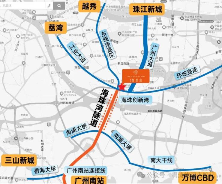 毗邻工业大道-南洲路-广州大道-洛溪大桥-海珠湾隧道(在建)等交通干道,海珠湾隧道预计今年9月通车,享15分钟珠江新城/琶洲双CBD生活圈。