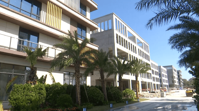 1月5日,记者走进位于乐东九所新区的银基总部产业园区项目建设现场看到,工人正在加紧临街绿化及部分厂房的门窗、外立面施工,加快项目建设步伐,争取春节前完成8栋厂房交付的目标任务。