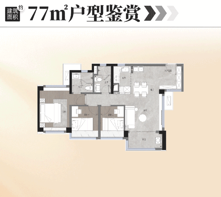 约77平户型室内更采用“少承重墙”设计,屋内大部分空间都能灵活调整,适应家庭不同阶段的需求。