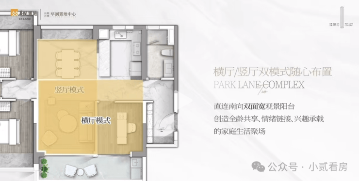 比如,打通客厅旁的x空间就是横厅模式,形成更大排场的会客厅。保留x空间,则是竖厅格局,叠加双阳台空间,也有不一样的生活体验。