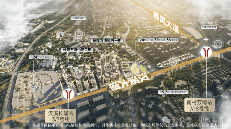 地铁:紧邻地铁3号线、7号线汉溪长隆站(步行约8分钟),距离18号线南村万博站1.2公里。