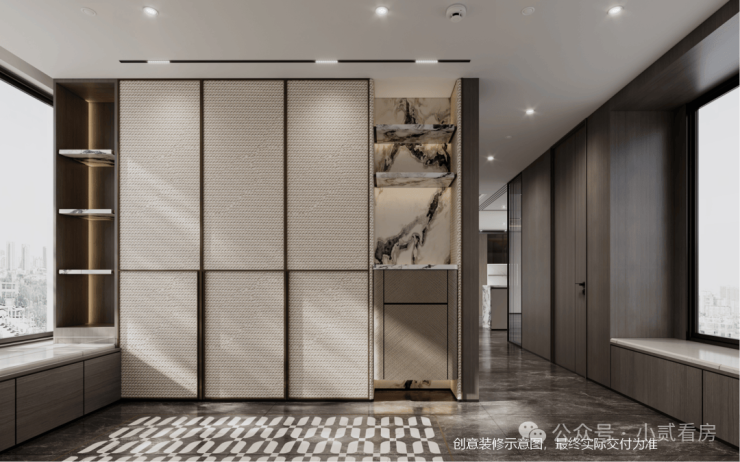 入户设有超大玄关,大面玻璃窗采光,一进家门光线充足,视线明亮,归家的心情都明朗。