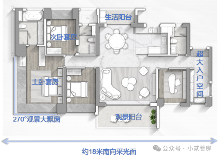 最吸睛的是它的主卧去到28㎡,而且做了约12米长的270°无遮挡U型飘窗,室内光线敞亮,空间通透,非常有豪宅感。