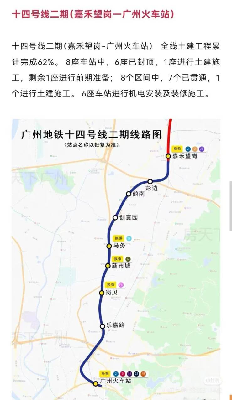 目前14号线二期(嘉禾望岗-广州火车站)24年8月份土建工程进度62%,预计2025年建成(具体时间以官方公告为准)。