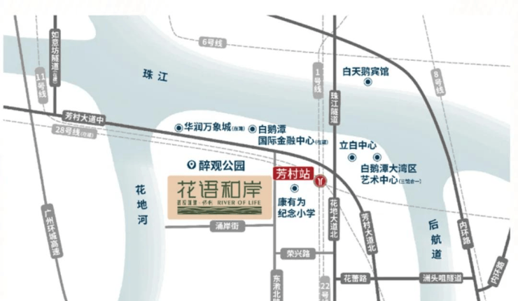 ıllı 主干道/高速/隧道:花地及芳村大道交汇,1km内有珠江/洲头咀/如意坊隧道(在建),接驳内环及环城