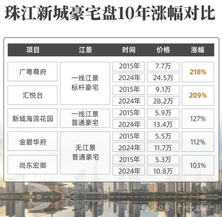 像同在珠江新城东区,占据一线江景的标杆顶豪盘,不仅总价更高,涨幅也远远甩开其它没有江景或者品质一般的豪宅盘。