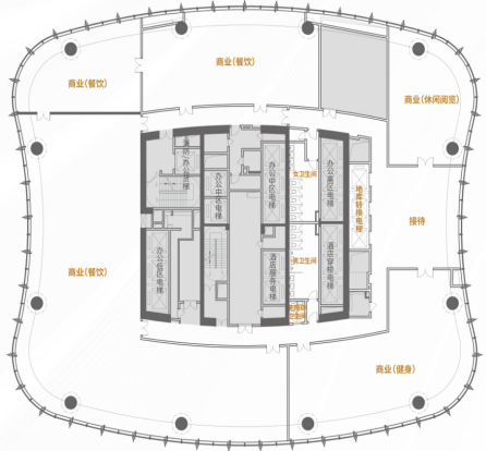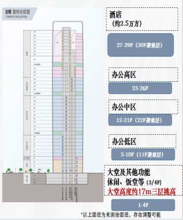 楼层分布:地上39层,地下3层;低区(5-10F)、中区(12-21F)、高区(23-26F)办公,27-39层为酒店。